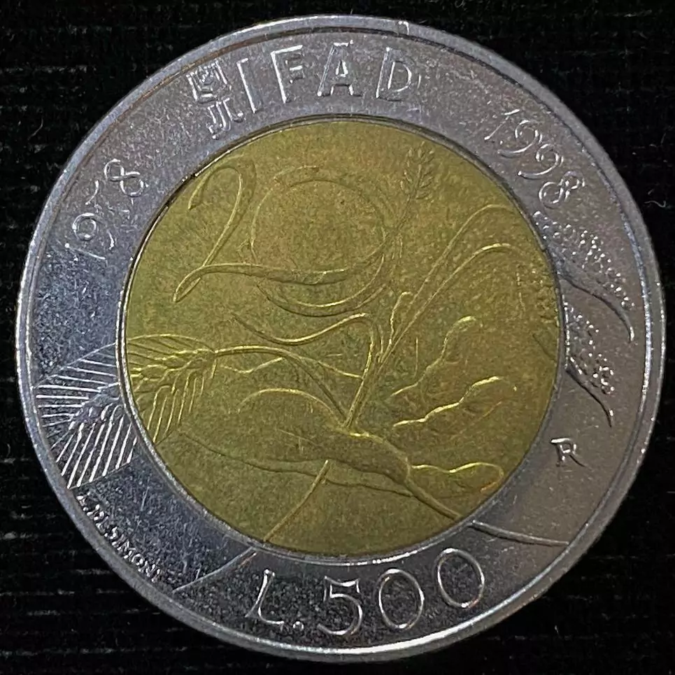 Reverso: Mão aberta segurando espigas de trigo e sorgo, com um globo solar acima formando o número “20”. Inscrição “IFAD” entre as datas “1978” e “1998”. Valor “L.500” abaixo, com a marca da casa da moeda (“R”) à direita e o nome da designer, Luciana De Simoni, à esquerda.
