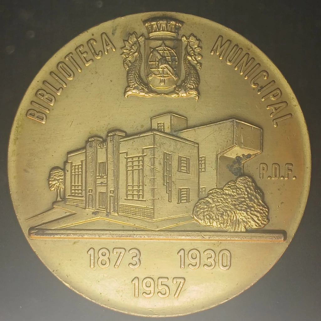 ANVERSO: Representação da Biblioteca Municipal do Distrito Federal, futura Biblioteca Parque do Rio, com a legenda P. D. F. - Prefeitura do Distrito Federal. No bordo superior constam os dizeres: "Biblioteca Municipal" ao redor das armas do Distrito Federal, hoje Município do Rio de Janeiro.