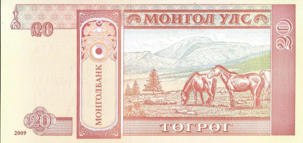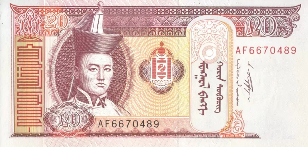Retrato de Damdiny Sühbaatar (2 de fevereiro de 1893 - 20 de fevereiro de 1923), membro fundador do Partido Popular da Mongólia e líder do exército partidário mongol que libertou Khüree durante a Revolução da Mongólia Exterior de 1921, um Paiza (Gerege) - uma tábua de autoridade para os funcionários e enviados mongóis, que permitia aos nobres e funcionários mongóis exigir bens e serviços à população civil, e o brasão de armas nacional