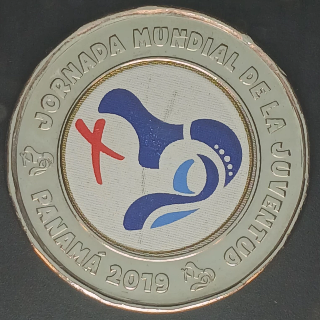 REVERSO: No centro do disco é represetado o logo da Jornada Mundial da Juventude Panamá 2019, o bordo contém a inscrição em legenda: "JORNADA MUNDIAL DE LA JUVENTUD - PANAMÁ 2019".