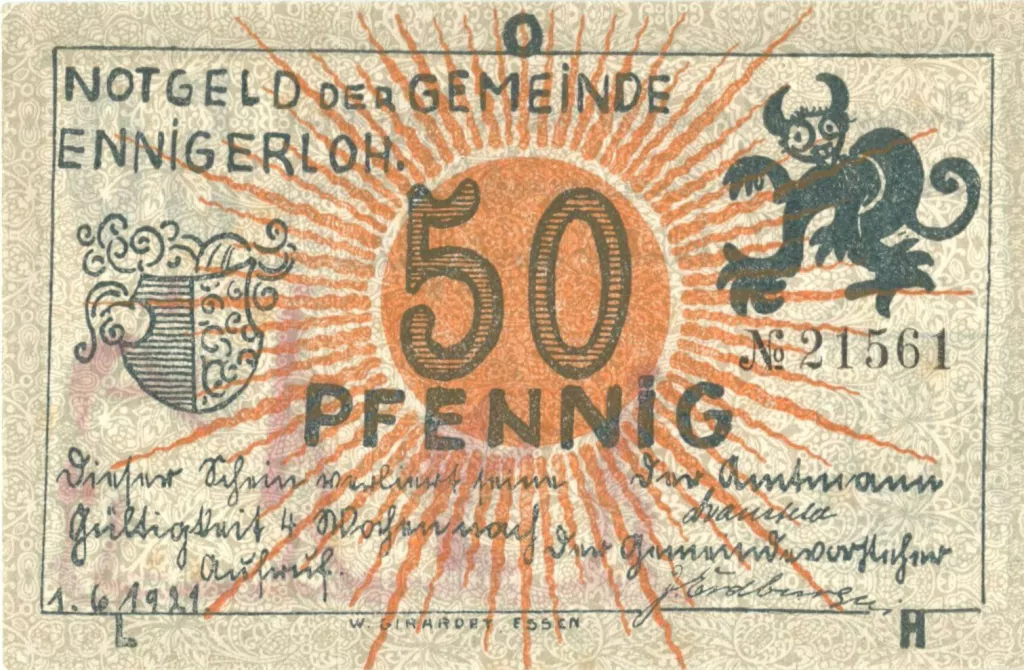 A cédula exibe o texto “Notgeld do município de Ennigerloh - 50 Pfennig"