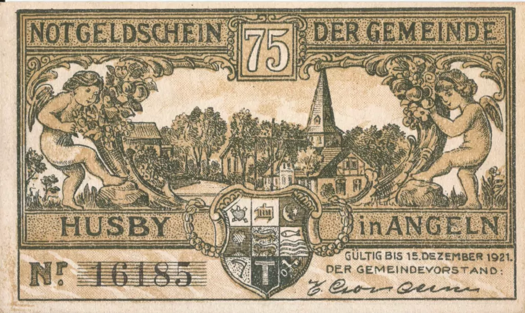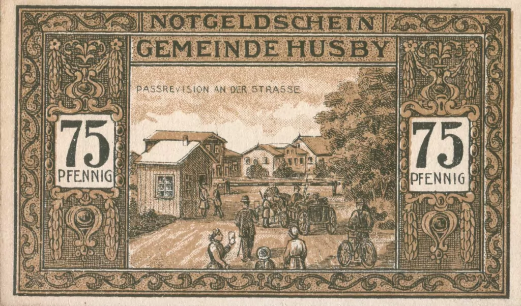 A cédula exibe “Notgeld do município de Husby, 75 Pfennig”, com uma arte e a legenda “Revisão de passaporte na estrada”.