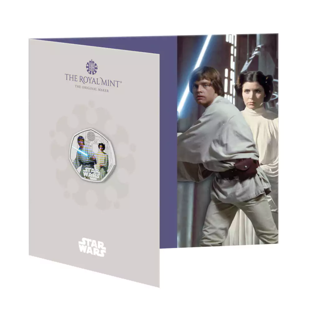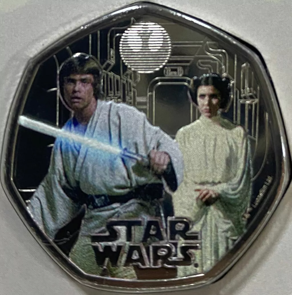 Anverso: Luke Skywalker e a Princesa Leia com um holograma em cima e letras em baixo.