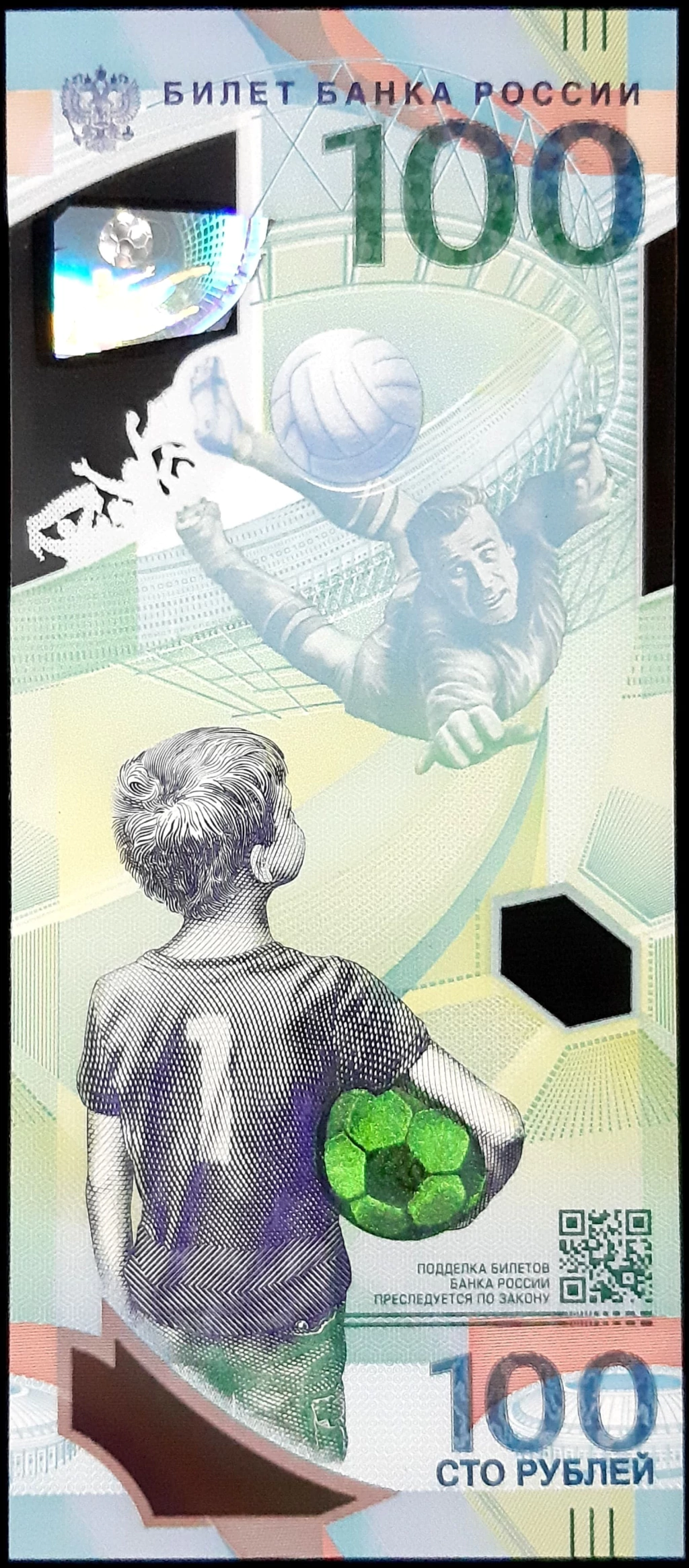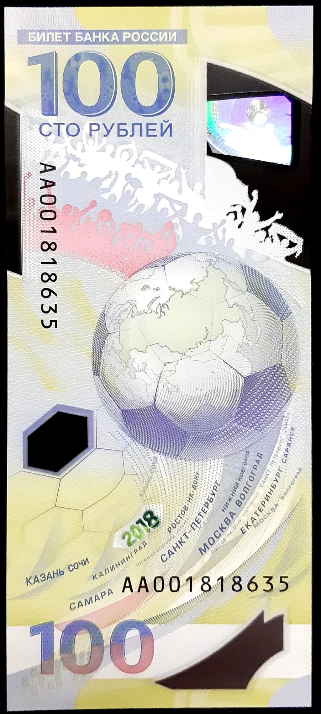 Reverso: Bandeira russa estilizada com silhuetas de adeptos de atletismo, globo estilizado sobre uma bola de futebol com o mapa da Federação Russa, nomes das cidades russas anfitriãs do Campeonato do Mundo de Futebol