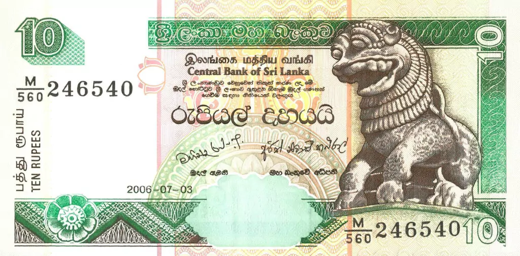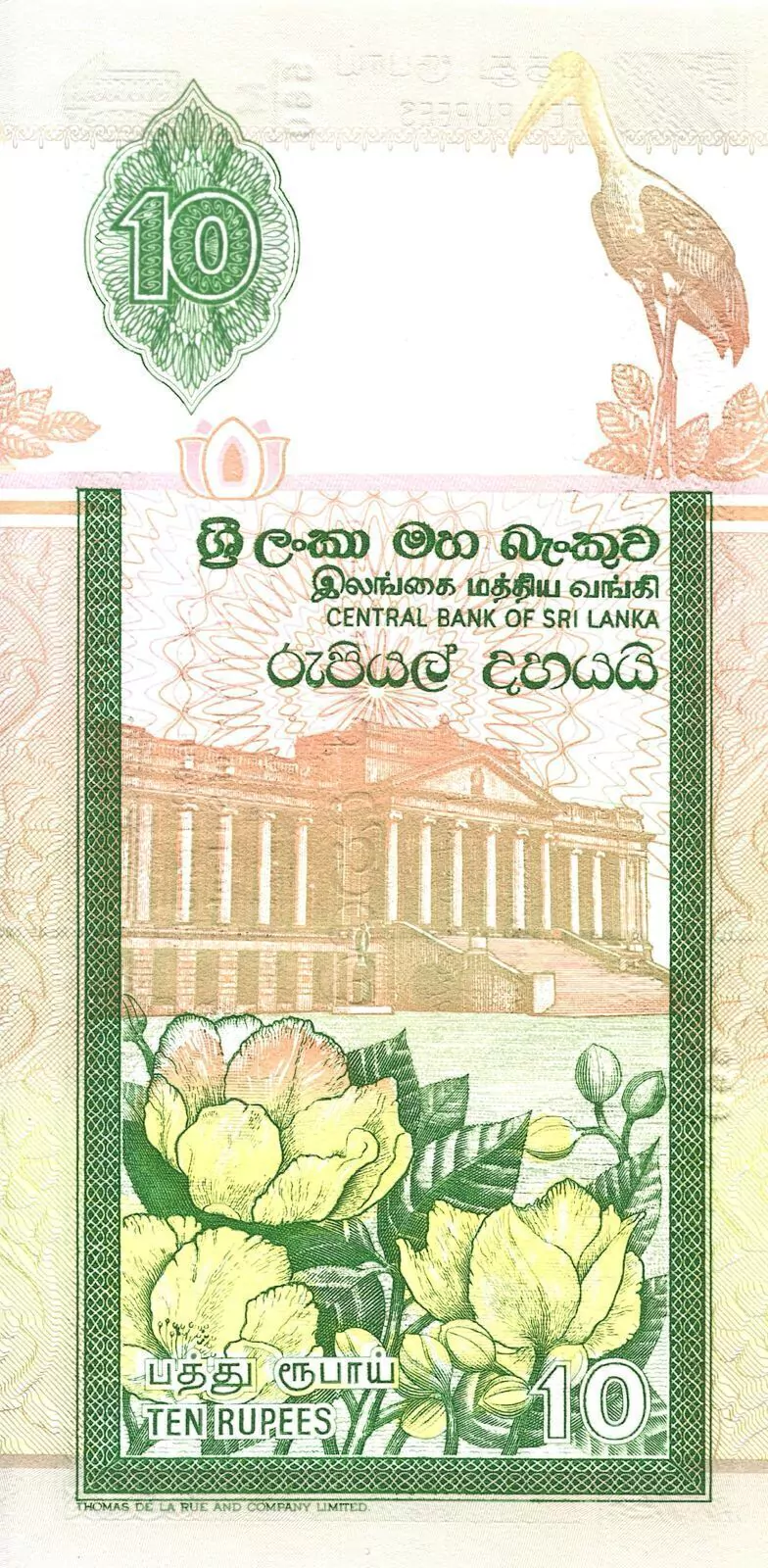 Cegonha pintada em cima à esquerda, edifício do Secretariado Presidencial em Colombo, flores em baixo.