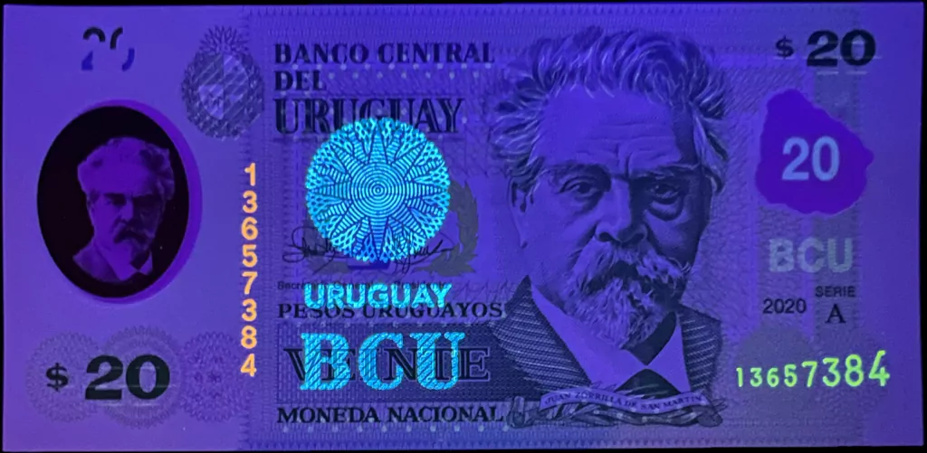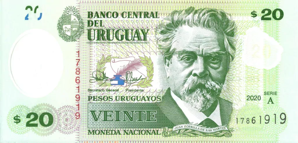 Juan Zorrilla de San Martín à direita, brasão de armas à esquerda acima da zona da marca de água.