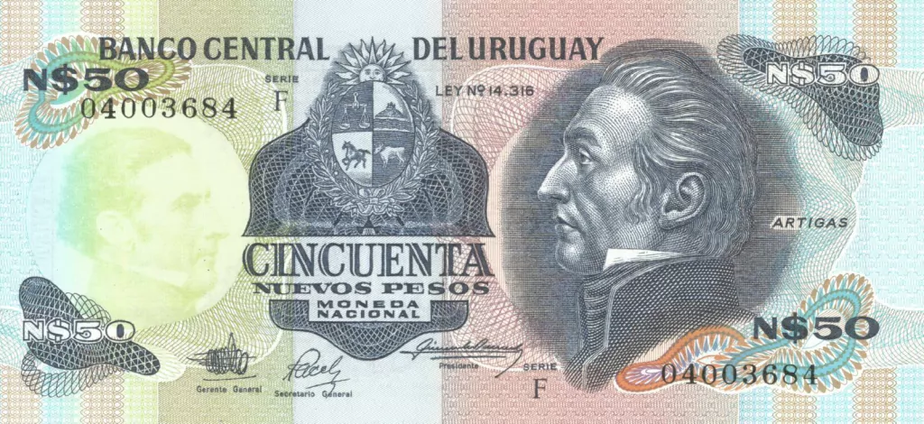 O herói nacional uruguaio José Gervasio Artigas (1764-1850), que foi o primeiro líder do movimento de independência, e o brasão nacional