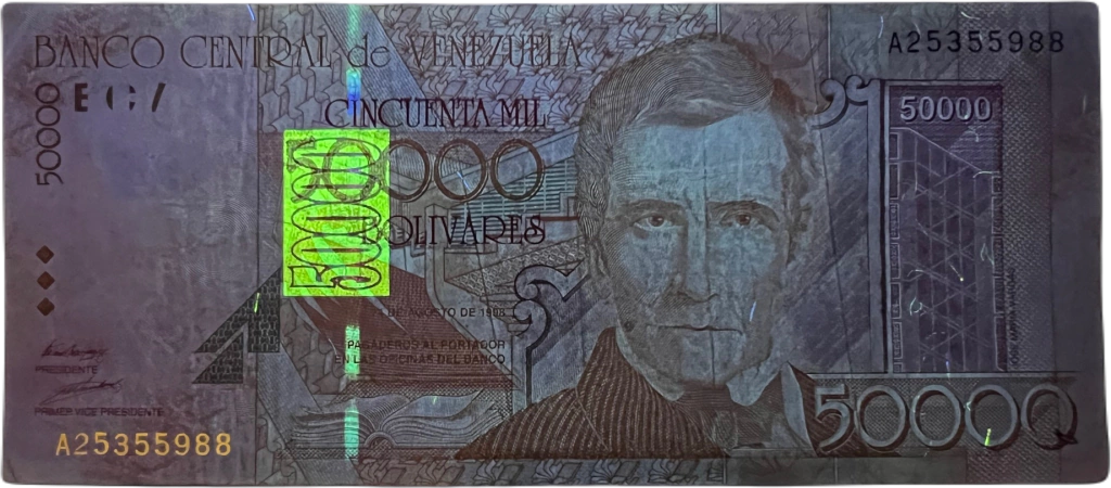 Desenho a vermelho. À direita, o retrato de José María Vargas, da autoria de Martín Tovar y Tovar, em 1875. No centro, o valor facial "50000" com a denominação em palavras "CINCUENTA MIL BOLIVARES" dividida em duas partes e a cláusula de pagamento "PAGADEROS AL PORTADOR EN LAS OFICINAS DEL BANCO" "Pagamentos ao portador nas agências do banco" abaixo. À esquerda, zona de marcas de água. Em cada canto, exceto no canto inferior esquerdo, o valor facial "50000". No canto superior esquerdo, o nome do emitente "BANCO CENTRAL DE VENEZUELA" "Banco Central da Venezuela". À direita da zona das marcas de água, encontram-se dois triângulos sobrepostos, impressos com tinta opticamente variável (OVI).